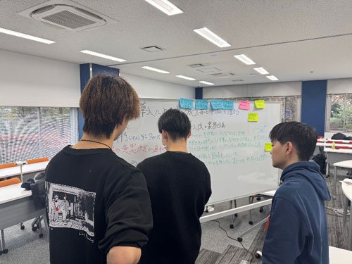 写真:課題に対して議論をする学生のみなさんと、講師として参加した当社社員