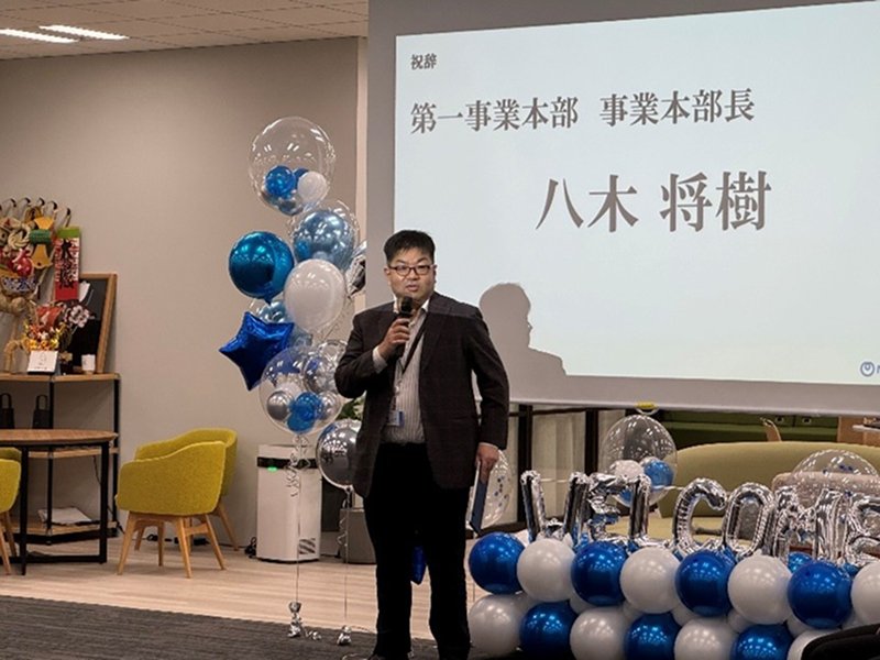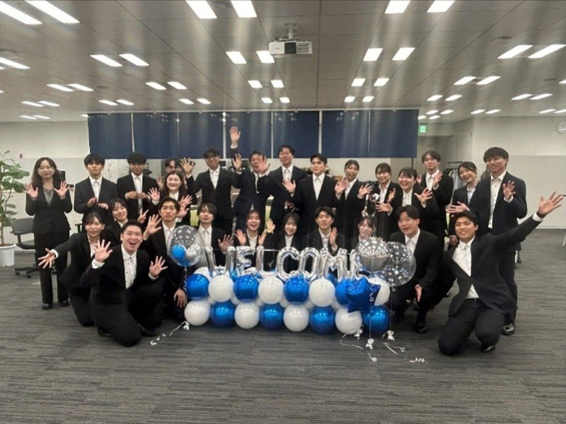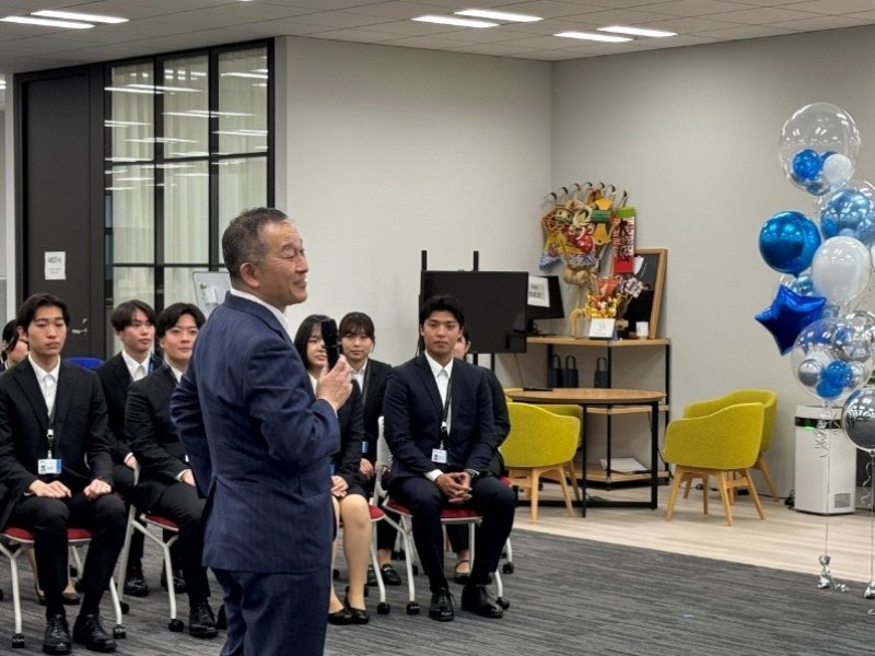 今年度の入社式のテーマは、「Welcome×ワクワク感」。新しい仲間を迎えるため、オフィスのオープンスペースで幹部をはじめ多くの社員が参加するイベントとなりました。